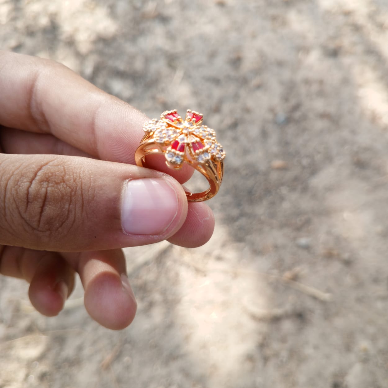 Necklace: A delicate gold-tone chain featuring an ornate V-shaped pendant with clustered red and white stones.